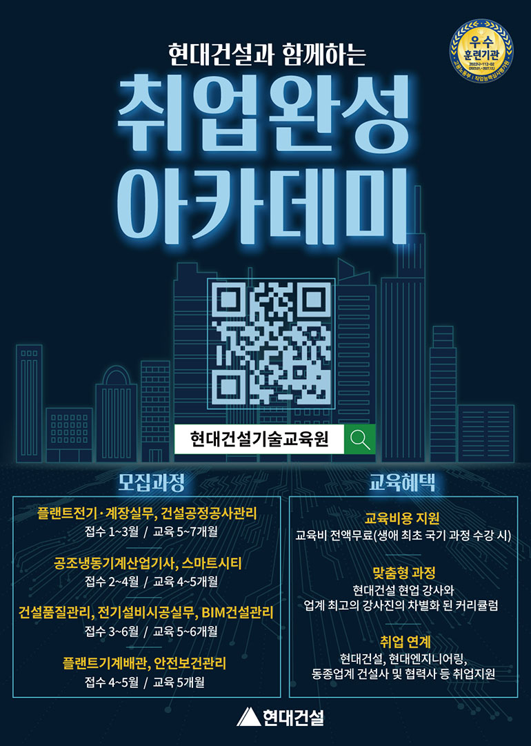 한편 취업완성 아카데미 지원은 현대건설 기술교육원 홈페이지(클릭)를 통해 가능합니다. 자세한 정보는 현대건설 기술교육원 홈페이지를 비롯해 매주 수요일 라이브로 진행되는 공식 유튜브 채널 온라인 설명회를 통해 제공받을 수 있습니다.