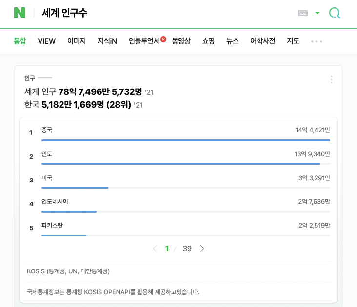 현재 전세계 인구수를 확인하는 가장 간단한 방법은 네이버에서 '세계 인구수'를 검색하면 된다. 세계 인구수와 국가별 인구수를 확인할 수 있다.