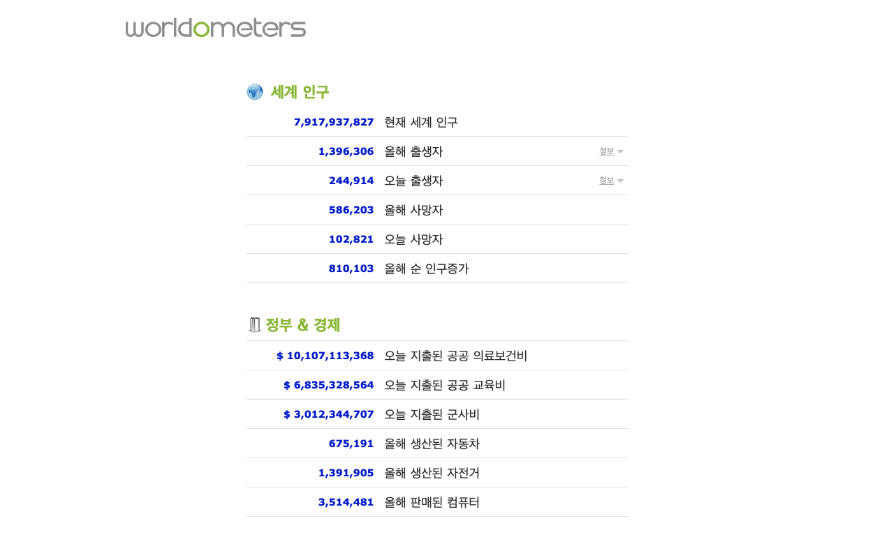 특히 월드오미터에서는 세계인구 뿐 아니라 경제, 사회, 식량, 물, 에너지 등 다양한 통계를 확인 할 수 있어 평소 관련 통계가 궁금했던 이라면 북마크해두자.