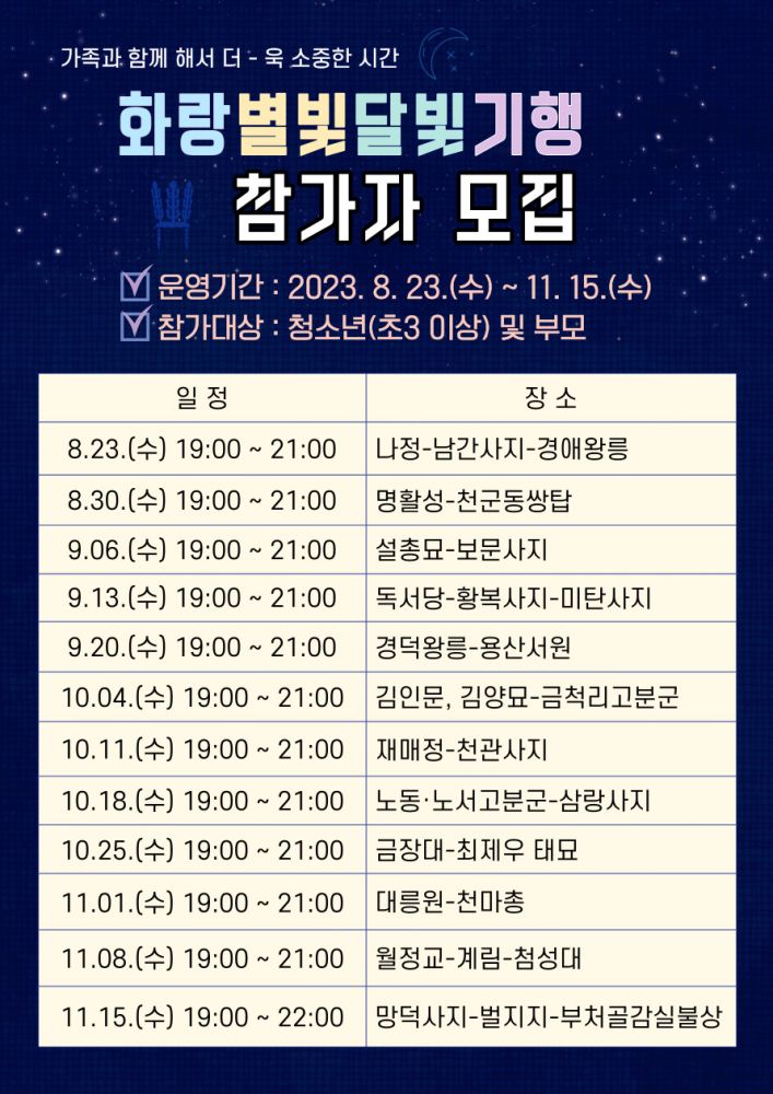 경주시가 지역의 다양한 문화유산을 가족과 함께 체험할 수 있는 하반기 ‘화랑별빛달빛기행’ 참가자를 모집한다. 화랑별빛달빛기행은 청소년비타민프로젝트의 일환으로 문화해설사와 함께 매주 수요일 저녁 지역의 문화유산을 탐방하는 활동이다.