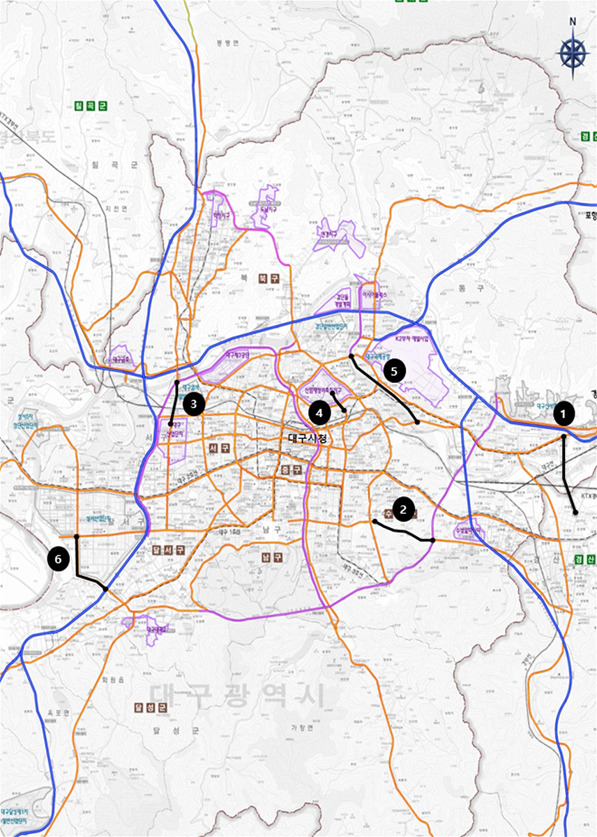 대구시의 국가계획에 선정된 사업은 '동구 안심~경산 임당 간' 도로건설 / '황금동~범안삼거리' 도로건설 / '매천대교~이현삼거리' 도로건설 / '파티마병원~신암북로' 도로건설 / '공항교~화랑교(금호강변)' 도로건설 / '달서대로 입체화' 등 총 6개 사업에 연장 15km이며 소요 사업비는 8,124억원 규모이다.