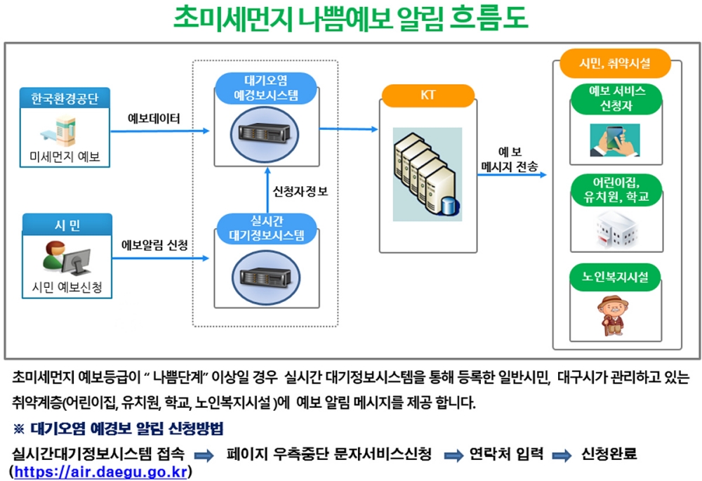 대구광역시는 5월부터 어린이집, 유치원, 학교, 노인시설 등 미세먼지 취약시설과 알림 문자를 신청한 시민들에게 초미세먼지(PM-2.5) 나쁨 알림서비스 제공을 확대 시행할 계획이다.