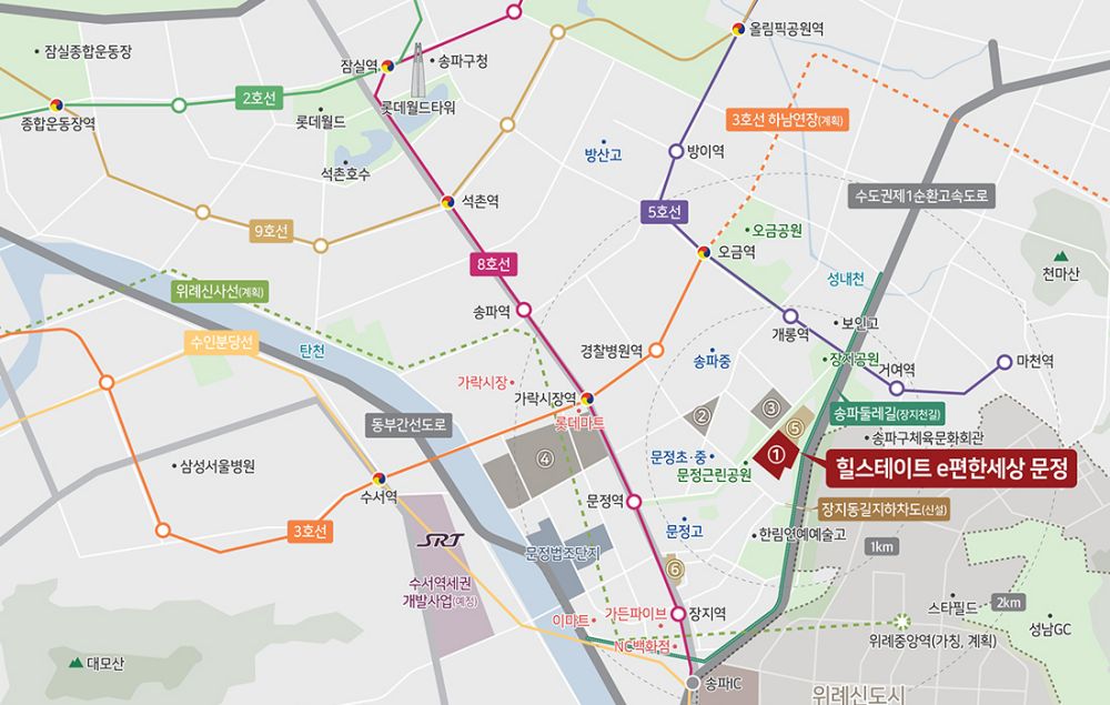 힐스테이트 e편한세상 문정은 반경 1km 내에 지하철 3호선 경찰병원역, 5호선 개롱역∙거여역, 8호선 문정역 3개 노선이 지나는 단지로 서울 전역을 편리하게 이동할 수 있다. 또한 SRT 수서역까지 대중교통을 이용해 20분대에 이동할 수 있어 광역으로의 이동도 수월하다. 여기에 송파IC 진입이 용이하며 수도권제1순환고속도로, 중부고속도로 등이 가까워 차량을 이용한 이동도 편리하다.