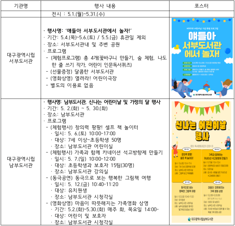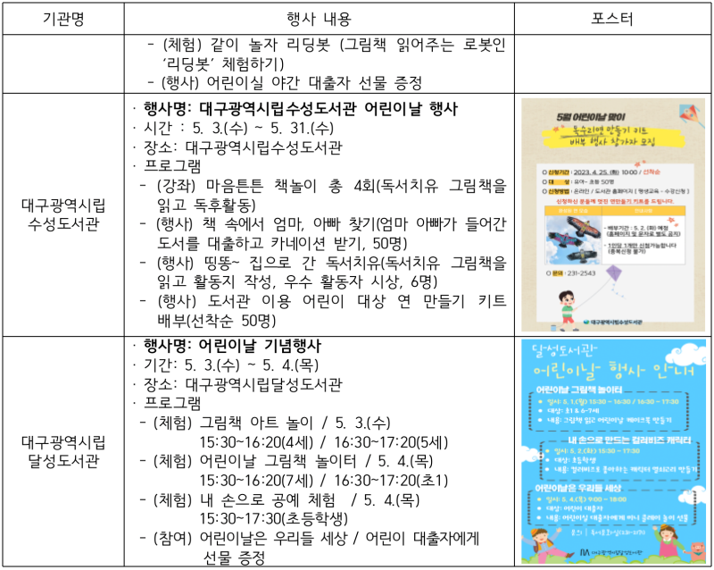 또한, ▲대구시립도서관 9곳은 책 놀이 활동, 연극 활동, 동극 공연, 인형 만들기 체험 등 어린이의 인문·예술적 소양을 키울 수 있는 다양한 체험활동 프로그램을 운영할 계획이다.