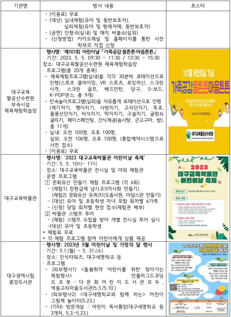 대구시교육청은 101주년 어린이날과 가정의 달을 기념하여 산하 15개 기관에서 200여 개 프로그램을 준비하고, 학생과 가족 단위의 독서·공예·체육 체험, 전시·연극 관람, 선물 증정 이벤트 등을 다양하게 운영한다.