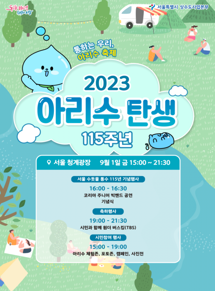 서울시는 서울의 수돗물 ‘아리수’가 시민과 삶과 함께한 115주년을 맞아 오는 9월 1일 다채로운 즐길 거리가 풍성한 아리수 축제를 개최한다.