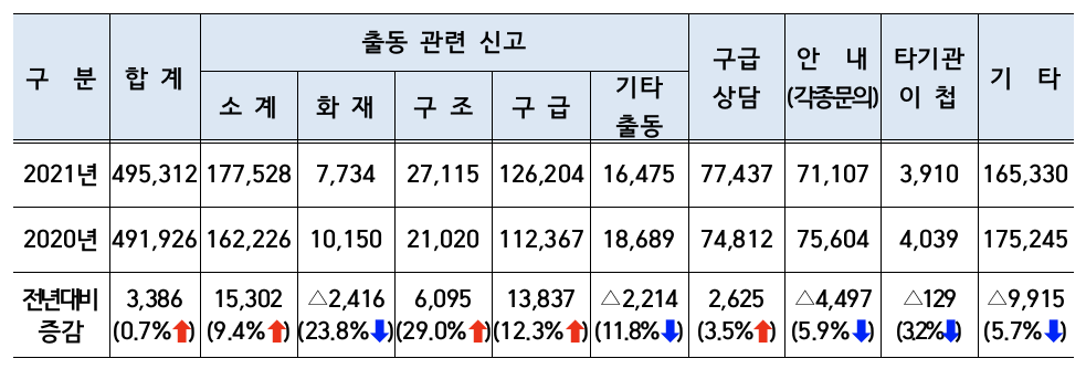 2021년 119신고는 전년도와 비슷한 수준을 보인 가운데 화재‧구조‧구급 등 현장 출동 관련 신고가 177,528건(35.8%)으로 가장 많았고, 병원‧약국‧응급처치 안내 등 각종 상담 안내 전화가 148,544건(30%), 타 기관 이관 등 기타 신고가 169,240건(34.2%)을 차지했다.