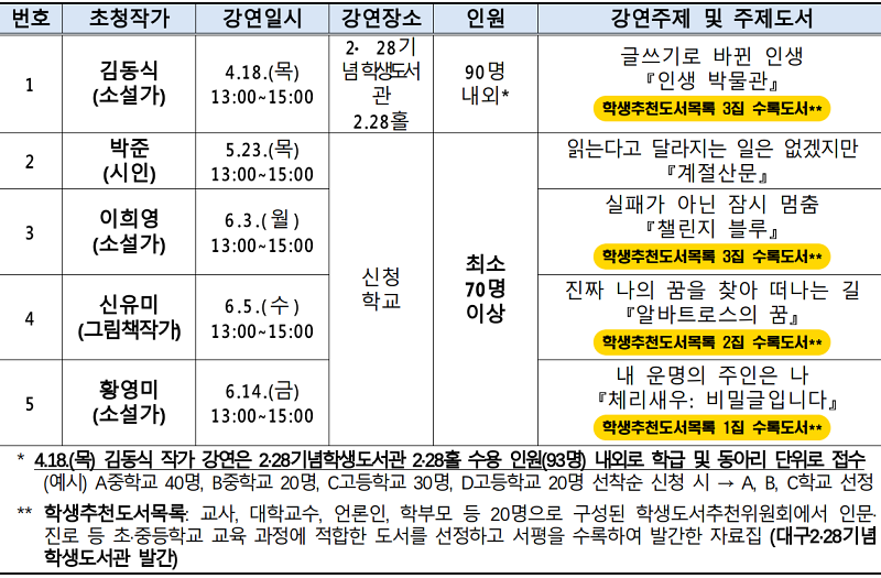 대구2·28기념학생도서관은 오는 4월부터 6월까지 총 5회에 걸쳐 중·고·각종 학교 70개교를 대상으로 2024년 상반기 ‘청소년 인문학 작가와의 만남’을 운영한다고 밝혔다.