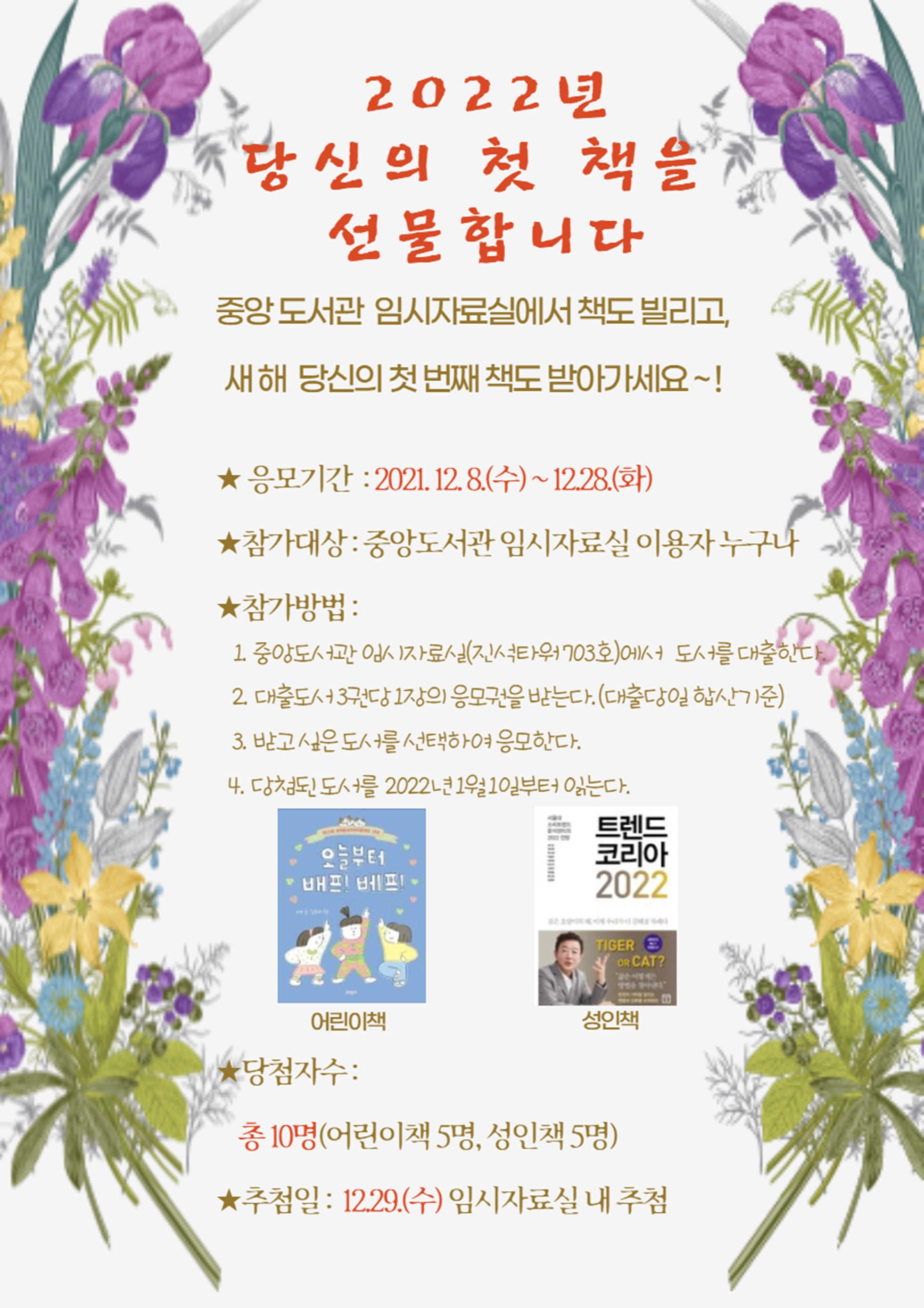 응모도서로 ▲어린이도서는 제22회 문학동네 어린이문학상 대상을 받은 ‘오늘부터 배프! 베프! / 지안 글, 김성라 그림’, ▲성인도서는 서울대 소비트렌드분석센터 2022 전망‘트렌드코리아 2022 / 김난도 등저’이며 연말연초에 읽어보면 좋을 베스트셀러 책들로 선정했다.