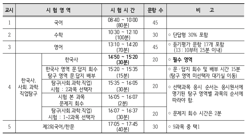 전년과 달라지는 부분으로 4교시 한국사 영역 문답지 회수 후 선택과목 문답지가 배부되며 전체 응시 시간 붙박이 전면 칸막이 대신 점심식사용 간이 3면 칸막이 사용된다.