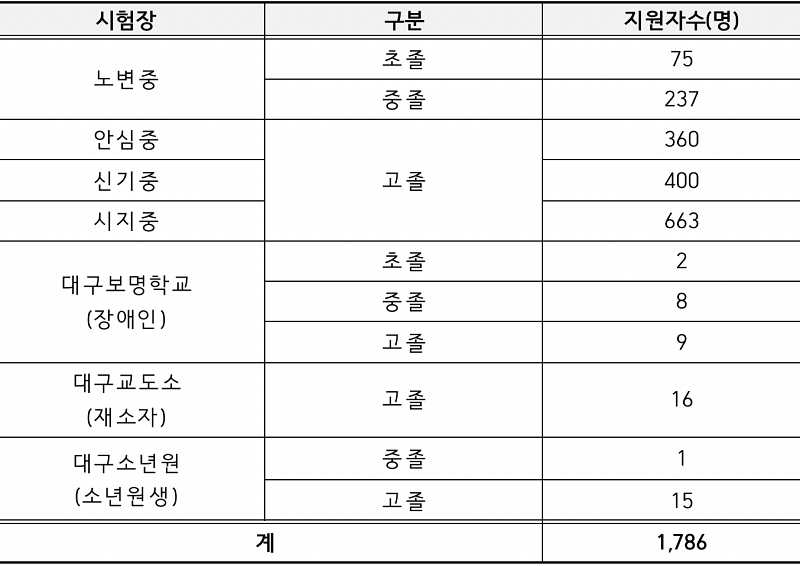 이번 시험에는 초졸 77명, 중졸 246명, 고졸 1,463명으로 총 1,786명이 응시할 예정이며, 장애인 19명, 재소자 16명, 소년원생 16명이 포함되어 있다.