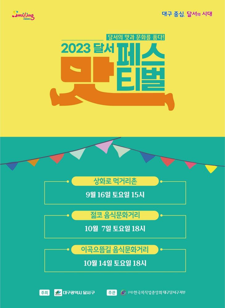 달서구의 먹거리골목 알리고 및 외식업소를 활성화시키기 위해 개최되는 2023년 달서 맛 페스티벌은 ▲9월 16일 상화로 먹거리촌 ▲10월 7일 두류 젊코 음식문화거리 ▲10월 14일 이곡으뜸길 음식문화거리에서 열린다.