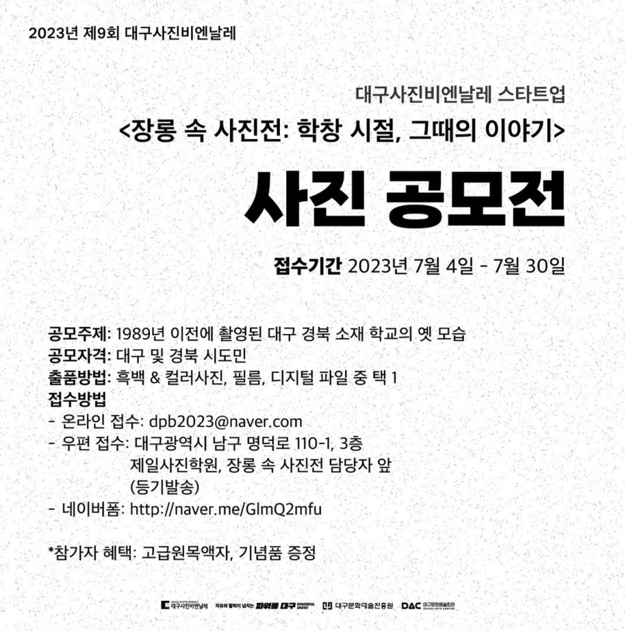 대구문화예술진흥원은 2023년 제9회 대구사진비엔날레의 일환으로 <장롱 속 사진전 – 학창시절, 그 때의 이야기>전을 개최한다. 이번 전시에는 과거 학창 시절 촬영되었던 다양한 모습(수학여행, 소풍, 운동회, 학예회 등)을 주제로 인물과 풍경의 옛 사진을 전시하여 작품에 담긴 대구의 역사·문화를 되새기고, 남녀노소가 공감하는 옛 추억을 되개기려 한다.