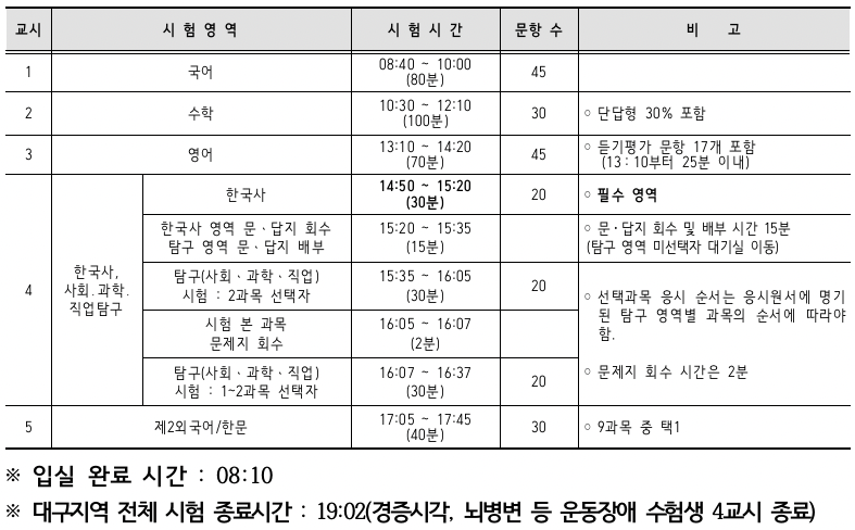 - 한국사와 탐구영역 간 예비 시간 15분(지난해부터 10분에서 15분으로 변경)