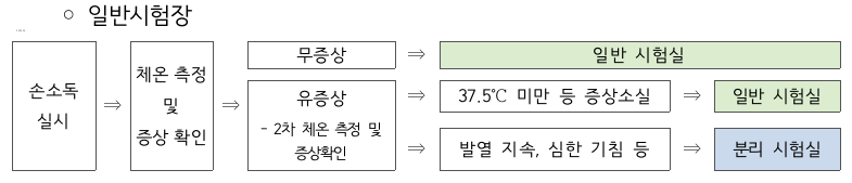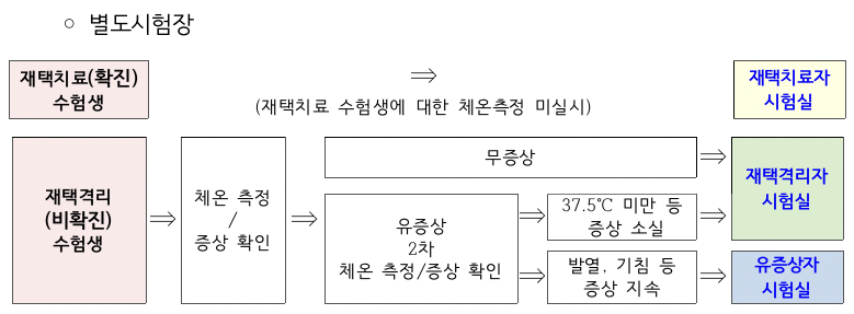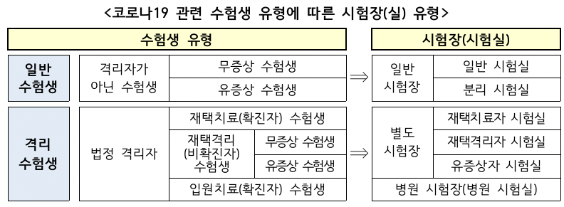 - 유증상자는 분리시험실, 격리자는 별도시험장, 입원 치료자는 병원시험장 응시