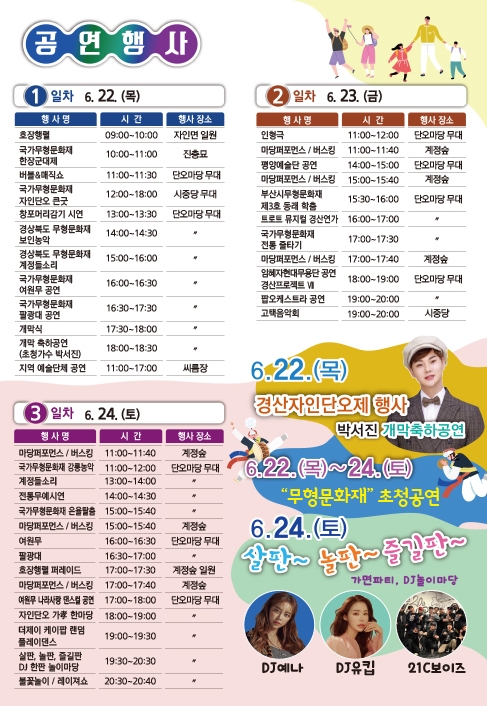 둘째 날인 23일은 어린이 관객들을 위한 인형극을 시작으로 부산시무형문화재 동래학춤과 전통 줄타기, 경산시립극단과 임혜자현대무용단의 공연이 이어진다. 저녁 시간에는 팝오케스트라 공연과 고택음악회로 시민들에게 현대와 전통문화가 함께하는 다채롭고 고즈넉한 시간을 선사할 예정이다.