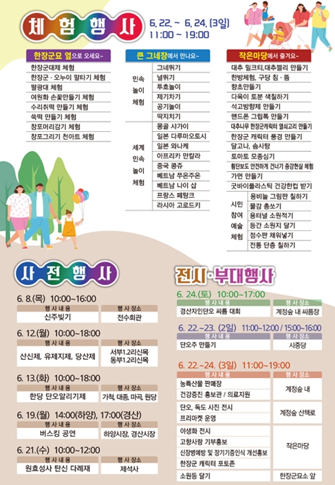 또한, 계정숲 곳곳에서 프리마켓, 야생화 전시, 단오 사진 전시 등 볼거리·먹을거리가 준비되어 있으며, 축제기간 호장행렬 퍼레이드와 마당퍼포먼스/버스킹이 축제장 내에서 수시로 진행될 예정으로 소소한 재미를 더한다.
