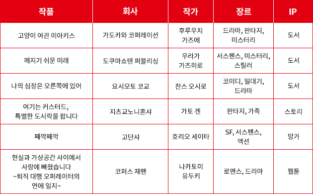 일본 IP로는 한국어로 번역 출간돼 국내 대중들에게 소개된 바 있는 작품이 다수 참가했다. 선정작 6편 중 『고양이 여관 미아키스』(가도카와 코퍼레이션), 『깨지기 쉬운 미래』(도쿠마쇼텐 퍼블리싱), 『여기는 커스터드, 특별한 도시락을 팝니다』(지츠교노니혼샤), 『째깍째깍』(고단샤)이 그 주인공이다.