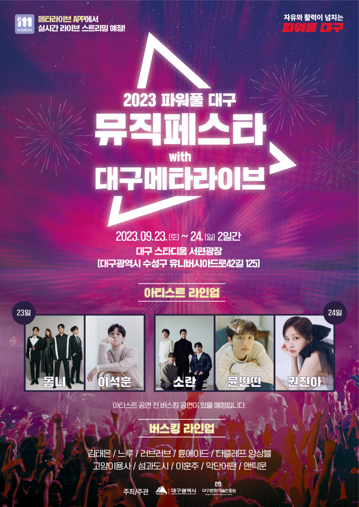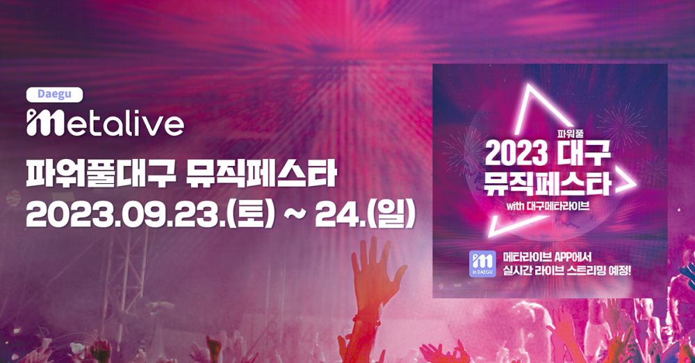 대구광역시는 오는 9월 23일(토)부터 9월 24일(일)까지 2일간, 대구관광분야 메타버스인 ‘대구메타라이브’ 공개를 기념·홍보하기 위해 (재)대구문화예술진흥원의 주관으로 『2023 파워풀대구 뮤직페스타』 콘서트를 대구메타라이브앱(온라인)과 대구스타디움 서편광장(오프라인)에서 동시 개최한다.