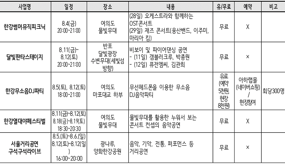 ① 한강썸머뮤직피크닉(8.4, 여의도한강공원 물빛무대) : 빈백에 누워 공연을 감상하는 한강 여름 축제의 대표 프로그램이다. 재즈와 국악을 접목해 새로운 사운드를 선사하는 국내 최고의 ‘K-재즈’ 디바 웅산, 재즈피아니스트 겸 가수인 마리아킴, 색소폰 연주자 이정식 등이 여름밤 수변무대를 감동의 향연으로 가득 채울 예정이다. 사전 예약 없이 누구나 무료로 관람할 수 있다.