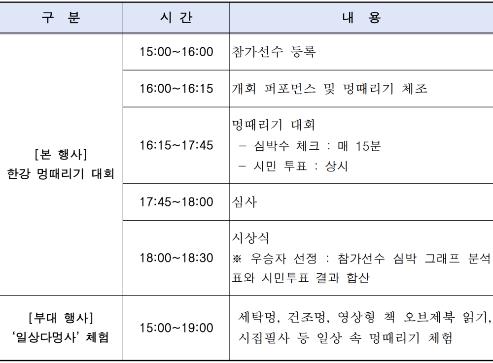 또한 대회 당일 15시부터 19시까지는 현장을 방문한 시민 누구나 무료로 참여할 수 있는 「일상다멍사」 프로그램이 운영된다. “일상속 멍때리는 순간을 발견해보자”는 취지로 마련된 이 프로그램은 ‘세탁멍’, ‘건조멍’, ‘영상형 책 오브제북 읽기’, ‘시집 필사’ 등을 상시체험할 수 있다.