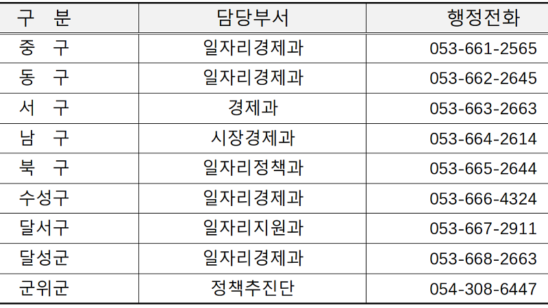 ❍ 참여자격 : 만 18세 이상 대구시 거주 가구소득 기준중위소득 70% 이하, 가구재산 4억원 이하인 미취업자