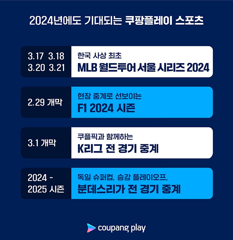 쿠팡플레이는 차별화된 스포츠 콘텐츠로 2024년에도 새로운 혁신을 선보인다. 오는 29일 개막하는 세계 최고의 자동차 경주대회 ‘2024 FIA 포뮬러 원 월드 챔피언십’의 모든 경기를 중계하고, 3월 1일부터 시작하는 2024 K리그, 17일부터 MLB 역사상 국내에서 처음 열리는 ‘쿠팡플레이와 함께하는 MLB 월드투어 서울 시리즈’를 선보인다. 하반기에는 2024-2025시즌 분데스리가 전 경기를 국내에서 첫 선보이며 그 외에도 스포츠팬들이 열광할 만한 다양한 스포츠 콘텐츠를 선보일 예정이다.