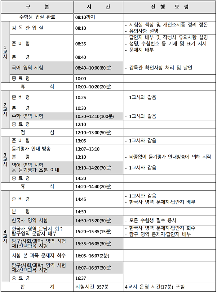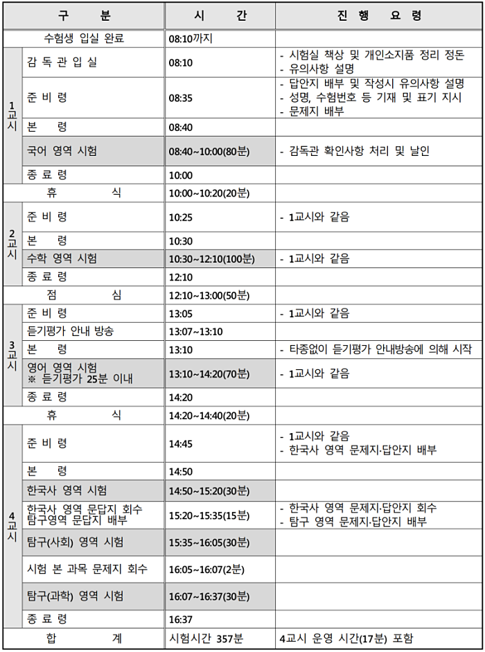 응시생은 특히 4교시 한국사 시험 종료 후 15분간 한국사 문제지ㆍ답안지를 회수하고 탐구 영역 문제지ㆍ답안지를 별도로 배부한다는 점에 유의해야 한다.
