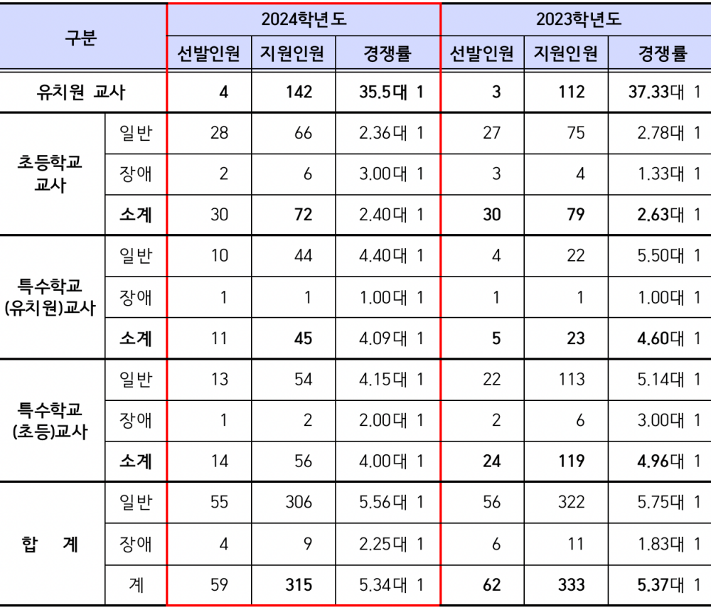 한편, 이번 2024학년도 유ㆍ초ㆍ특수(유치원, 초등)교사 1차 임용시험은 11월 11일(토)에 실시되고, 12월 13일(수) 시교육청 누리집을 통해 1차 합격자를 발표한다.