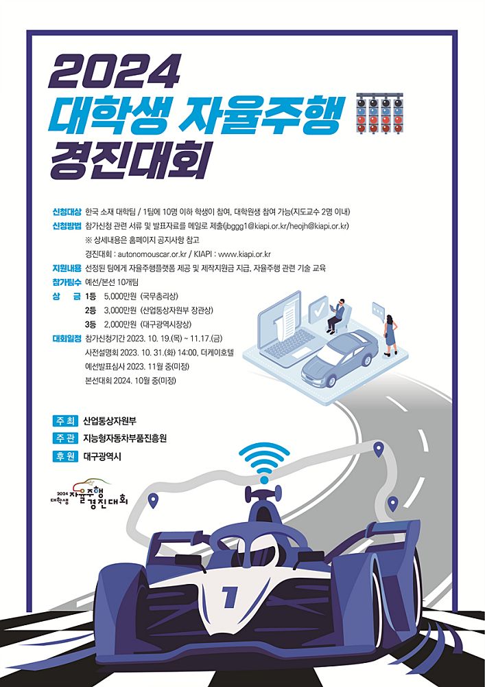 한편 2024 대학생 자율주행 경진대회는 7월 차량 1대씩 정해진 코스를 주행해 랩타임을 측정하는 예선 대회를 거쳐, 10월 중 대구의 지능형자동차부품진흥원 주행시험장에서 본 대회가 개최될 예정이다.