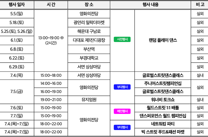또한, 본행사 이전 사전 홍보 프로그램인 '랜덤 플레이 댄스'가 5월 5일 영화의전당을 시작으로 5~6월 주말 오후 부산 곳곳에서 펼쳐져 시민들과 함께 즐길 예정이다.