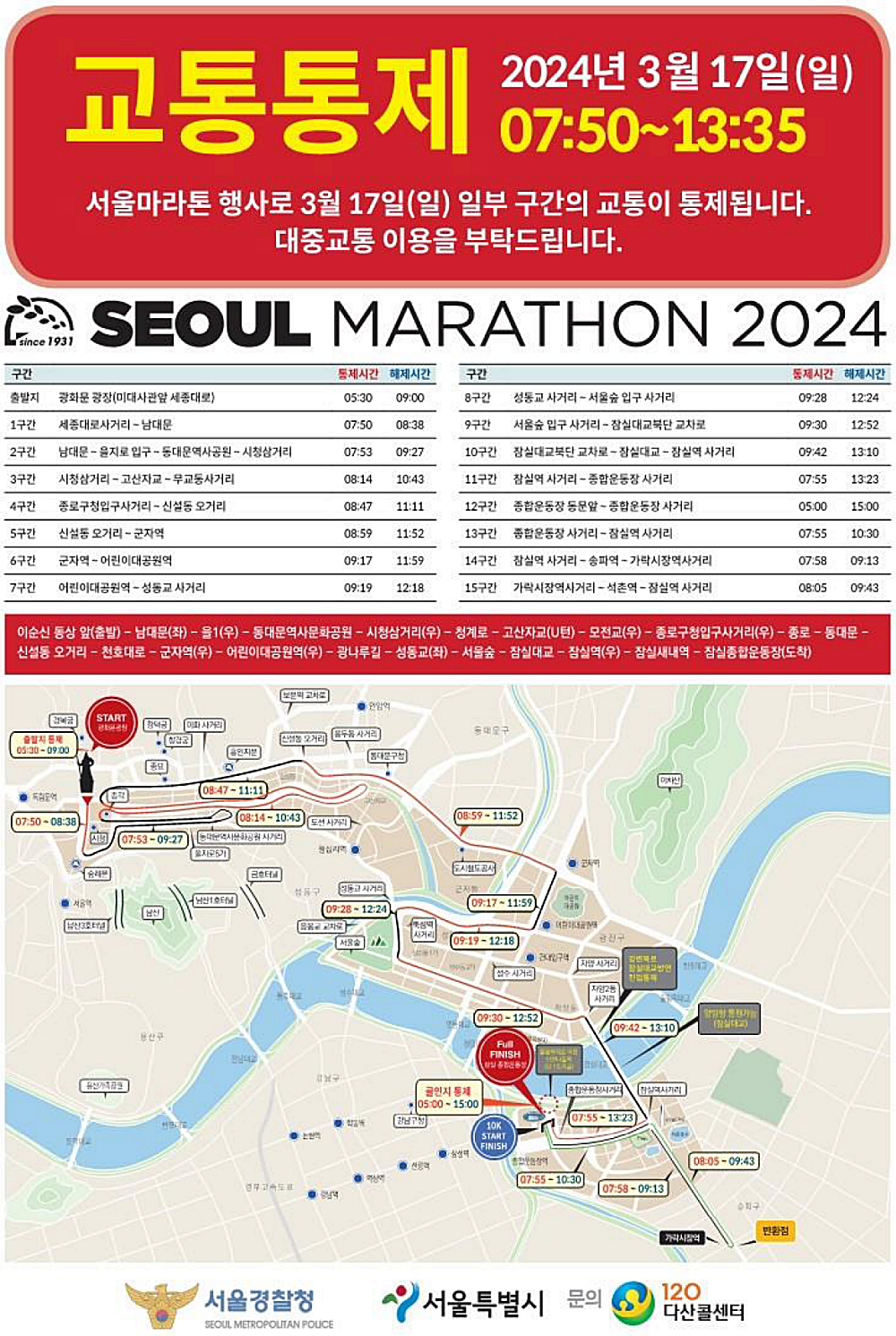 서울마라톤 관련 정보 및 교통통제 등 자세한 사항은 ‘120 다산콜센터’(국번없이 120)로 문의하거나 ‘2024 서울마라톤 누리집’(https://www.seoul-marathon.com)을 참고하면 된다.