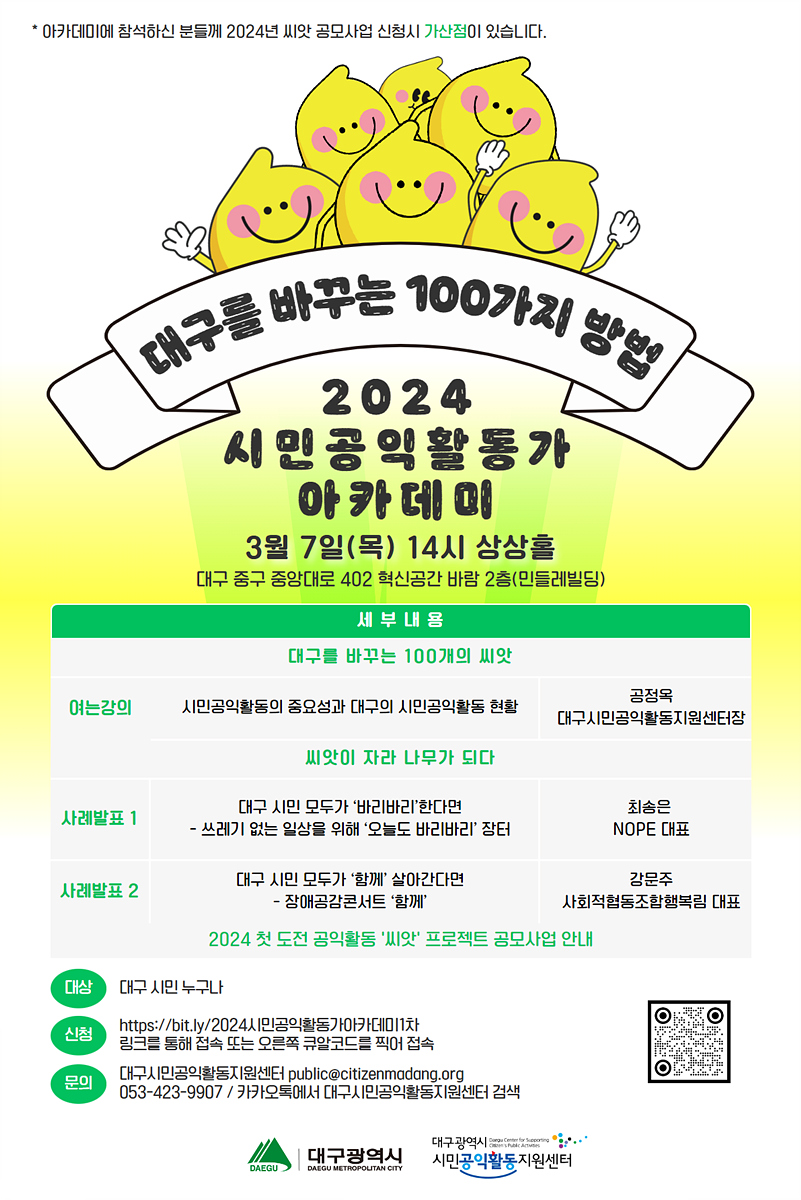 아울러 이번 아카데미 참여자에 대해서는 ‘2024 첫 도전 씨앗’ 프로젝트 공모사업 신청 시 가산점을 부여한다. ‘시민공익활동가 아카데미’에 대한 보다 자세한 문의는 전화(053-423-9907), 카카오톡 플러스친구(대구시민공익활동지원센터), 방문(대구광역시 중구 명덕로 101, 3층) 등을 이용하면 된다.