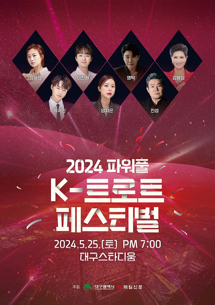‘2024 파워풀 K-트로트 페스티벌’이 5월 25일(토) 저녁 7시 대구스타디움 주경기장에서 열린다. 이번 행사에는 국내 정상급 트로트 가수인 김용임, 박서진, 양지은,영탁, 이찬원, 장윤정, 진성이 출연(가나다순)해 시민들에게 수준 높은 공연을 선보일 예정이다.