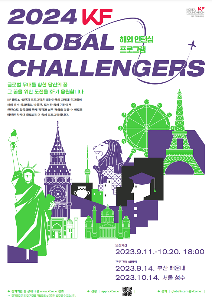 KF(Korea Foundation, 한국국제교류재단)는 대한민국 청년들이 해외 유수 싱크탱크, 박물관, 도서관, 국제기구에서 실무 경험을 쌓을 수 있도록 지원하는 < KF 글로벌 챌린저 프로그램 > 참가자를 9월 11일(월)부터 10월 20일(금)까지 공개 모집한다.
