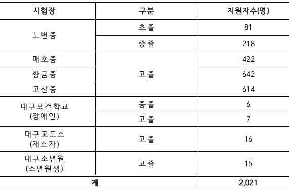일반 응시자 중 ▲초졸과 중졸은 노변중에서, ▲고졸은 매호중·황금중·고산중에서, ▲재소자와 소년원생은 대구교도소·대구소년원에서, ▲장애인 응시자는 대구보건학교에서 각각 시험을 치르고, 응시자들은 시교육청 누리집(www.dge.go.kr)을 통해 자신의 시험 장소를 확인해야 한다.