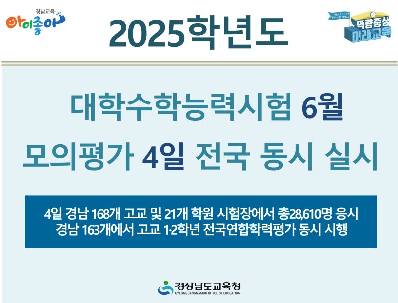경상남도교육청은 이번 달 4일 전국 동시에 실시하는 ‘2025학년도 대학수학능력시험(이하 수능) 6월 모의평가’에 경남지역에서 28,610명이 응시한다고 밝혔다. 또 같은 날 실시하는 ‘6월 전국연합학력평가’에는 경남지역 고1·2 재학생 58,270명이 응시한다.