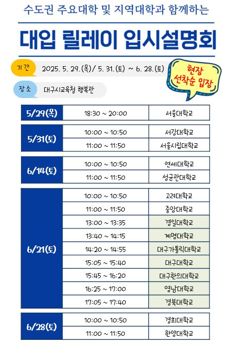 6월의 남은 대학별 일정은 ▲ 연세대, 성균관대 6월 14일(토) 10:00~11:50, ▲ 고려대, 중앙대 6월 21일(토) 10:00~11:50, ▲ 대구․경북권 7개 대학교 6월 21일(토) 13:00~17:40, ▲ 한양대, 경희대 6월 28일(토) 10:00~11:50이다. 대구․경북 7개 대학의 입시설명회는 경일대, 계명대, 대구가톨릭대, 대구대, 대구한의대, 영남대, 경북대 순으로 진행된다.