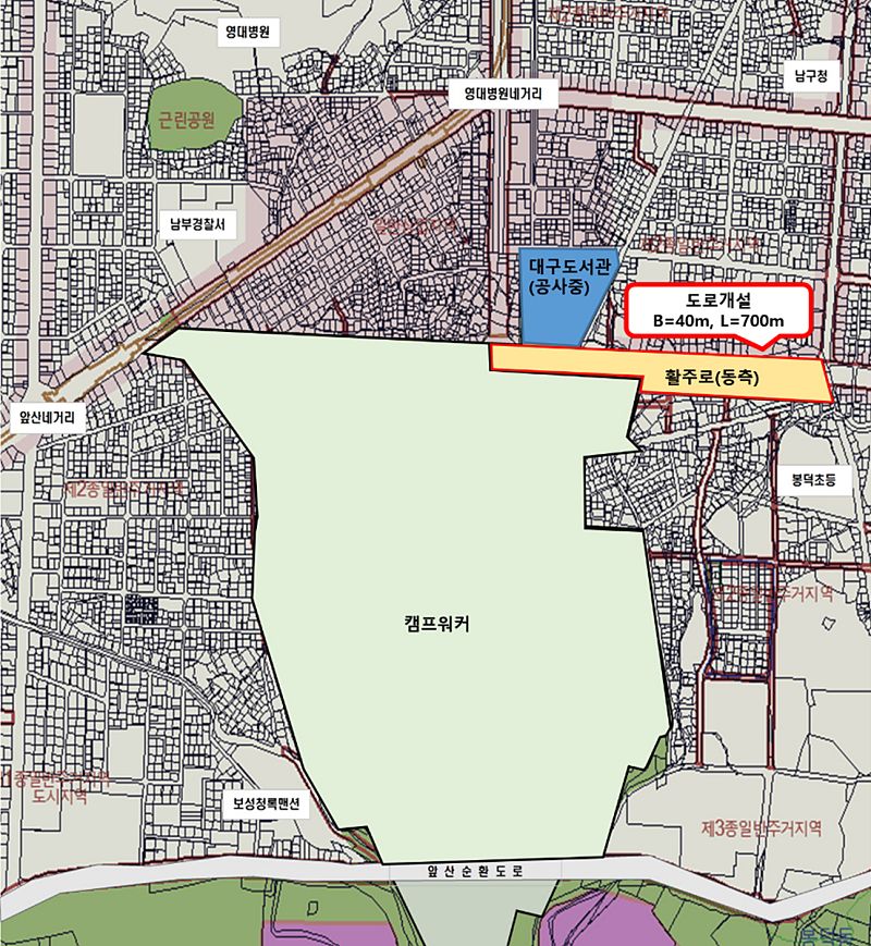 대구광역시는 캠프워커 부지로 인해 단절된 3차 순환도로를 연결해 도심 간 접근성을 높이고 교통정체를 해소하고자 영대네거리 남편과 봉덕초교 구간을 연결하는 왕복 8차선 도로 건설공사를 2월 착공할 예정이다.