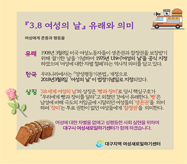 우리나라에서는 2018년부터 3월 8일을 법정기념일로 지정해 ‘여성의 날’로 기념하고 있으며, 대구시에서도 근로여건 개선을 위해 해마다 다양한 기념행사를 추진해 오고 있다.