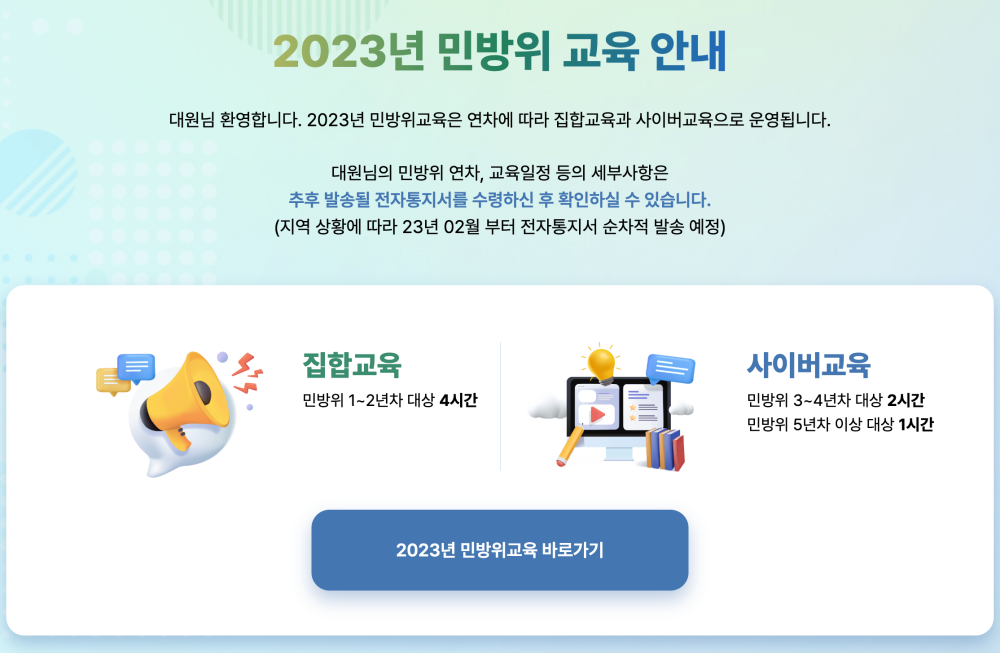 * 민간직장민방위대장 대상(70여 민방위대) 사이버 교육 과정은 2024년 개설 운영 예정