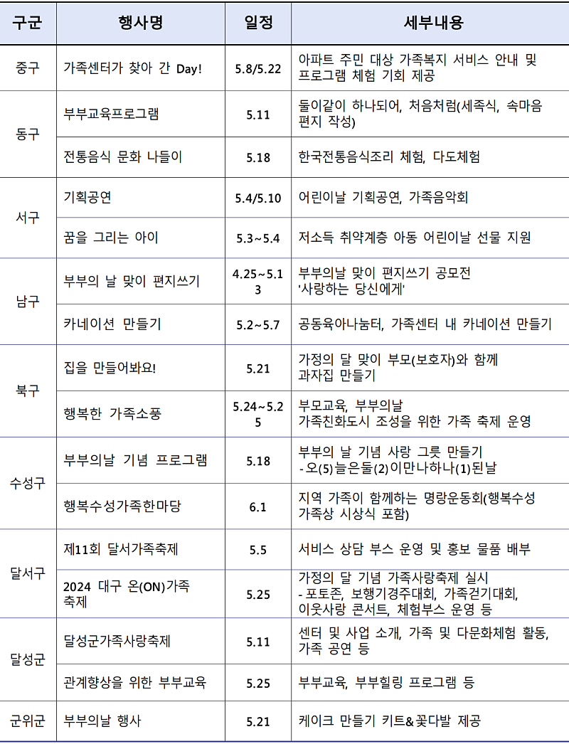 수성구 가족센터는 부부의 날 기념, 사랑 그릇 만들기 ‘오(5)늘은 둘(2)이 만나 하나(1)된 날’ 행사를 개최한다. 달서구 가족센터는 두류공원 일대에서 보행기 경주대회, 가족 포토존, 가족걷기 대회, 이웃사랑 콘서트, 체험부스 등을 운영하는 ‘대구 온(ON) 가족 축제’를 개최한다.