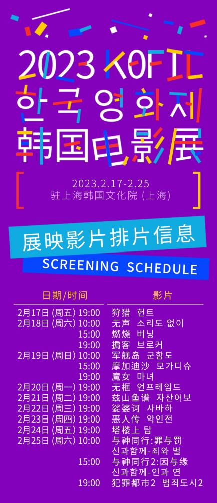 영화진흥위원회 중국사무소는 한중 간 영화 교류 증진을 위해, ‘KOFIC 한국영화제(상하이)’(주최:영화진흥위원회, 주상하이한국문화원)를 개최한다. 이번 행사는 2014년 이후 9년만에 중국에서 개최되는 한국영화제로서 이번 상하이 행사의 개막식은 주상하이한국문화원의 재개관 행사를 겸하여 열리게 된다.
