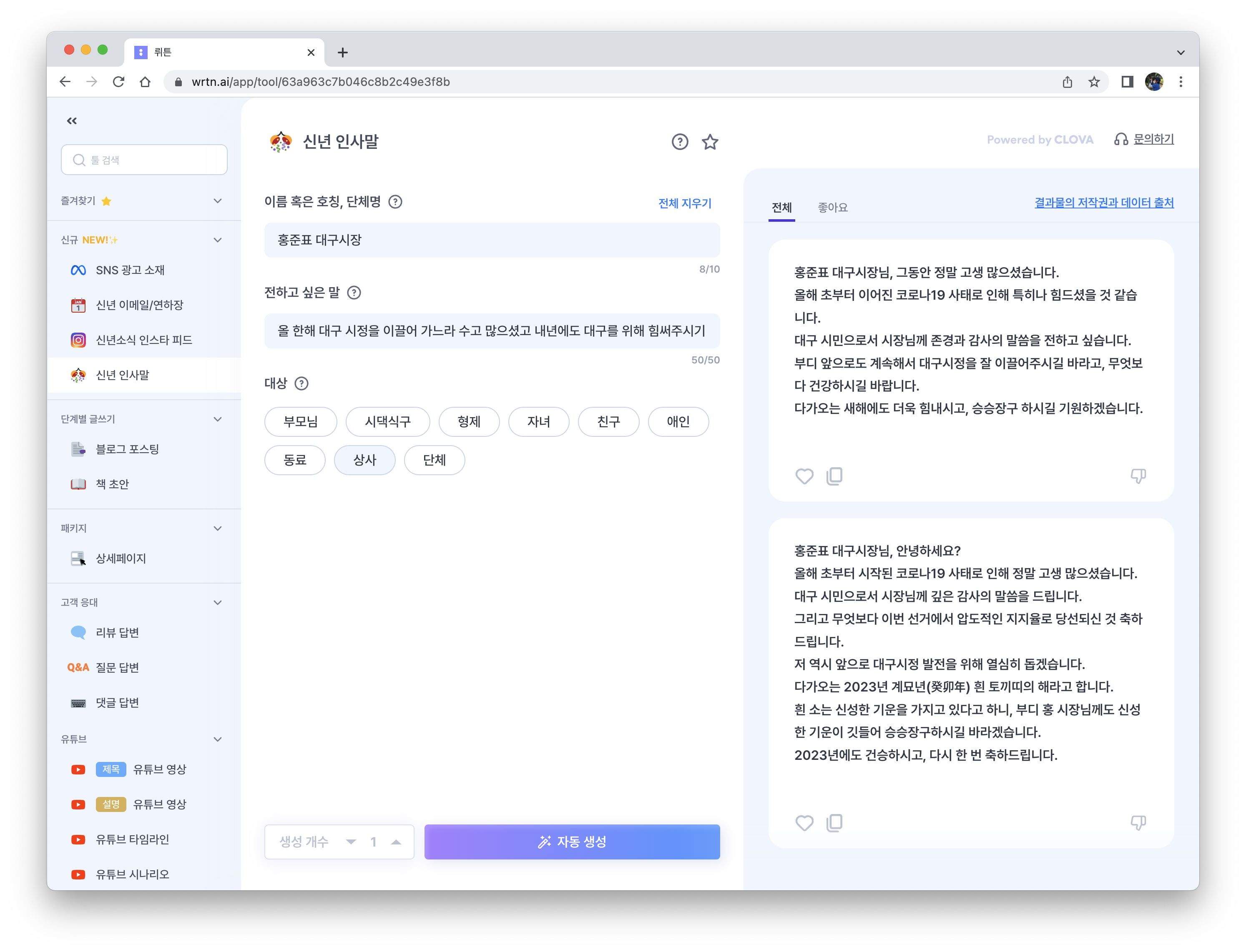 신규 툴 중에서 신년 인사말을 선택한 뒤 이름 혹은 호칭란에 '홍준표 대구시장', 전하고 싶은 말에는 '올 한해 대구 시정을 이끌어 가느라 수고 많으셨고 내년에도 대구를 위해 힘써주시기 바랍니다'고 적었다. 대상으로는 격식을 갖추기 위해 '상사'를 선택했다. 그리고 하단에 자동 생성을 버튼을 눌렀다. 몇초가 지난 후 AI가 작성한 신년 인사말이 우측에 나타났다.