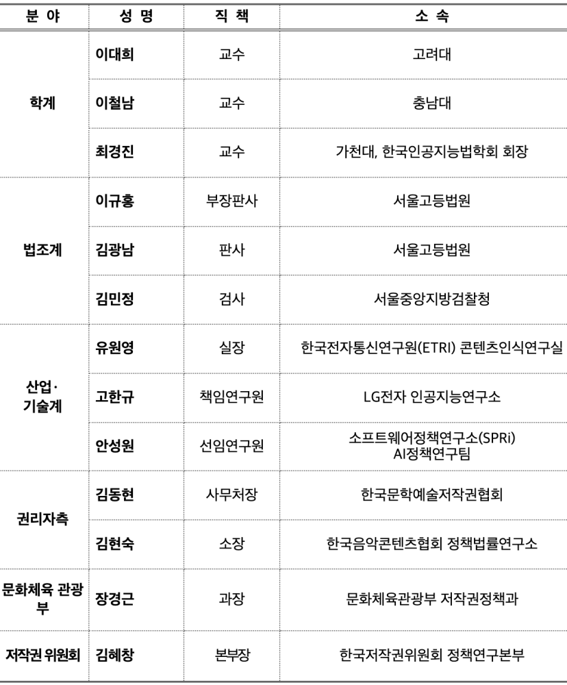 문체부는 이러한 문제를 선제적으로 논의하기 위해 저작권 학계와 법조계, AI 산업계와 창작자 등 현장 전문가와 이해관계자가 참여하는 워킹그룹을 구성하고 올해 2월부터 9월까지 8개월간 운영할 예정이다.