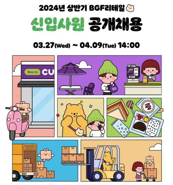 글로벌 유통 플랫폼, BGF리테일로 오세요! 편의점 CU를 운영하는 BGF리테일이 내달 9일까지 상반기 신입사원을 공개 채용하고 지원자들과의 소통을 위해 각종 리크루팅 행사를 진행한다.