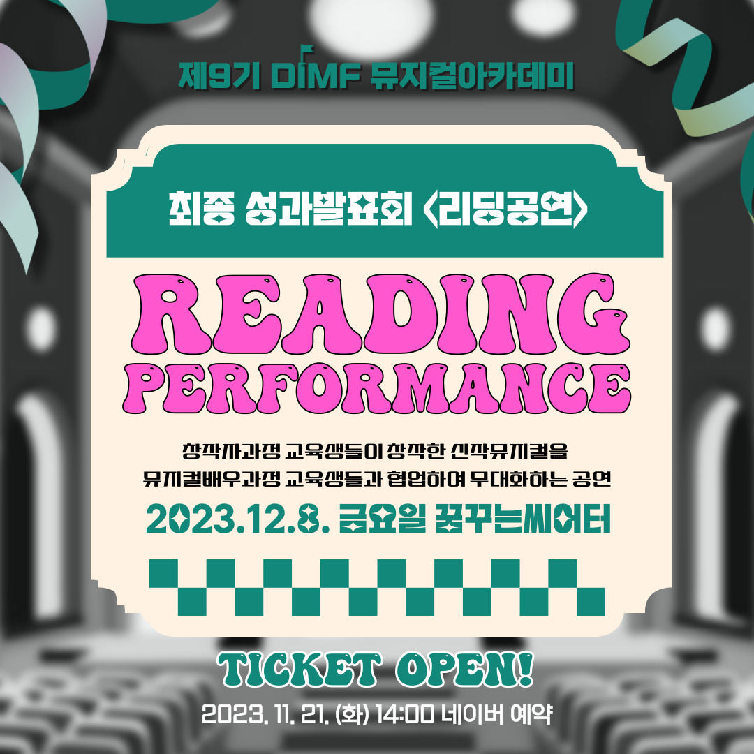 ‘DIMF 뮤지컬아카데미’가 제9기 교육생의 최종 성과발표회 ‘리딩공연’을 오는 12월 8일(금) 오후 2시 꿈꾸는씨어터에서 개최한다.
