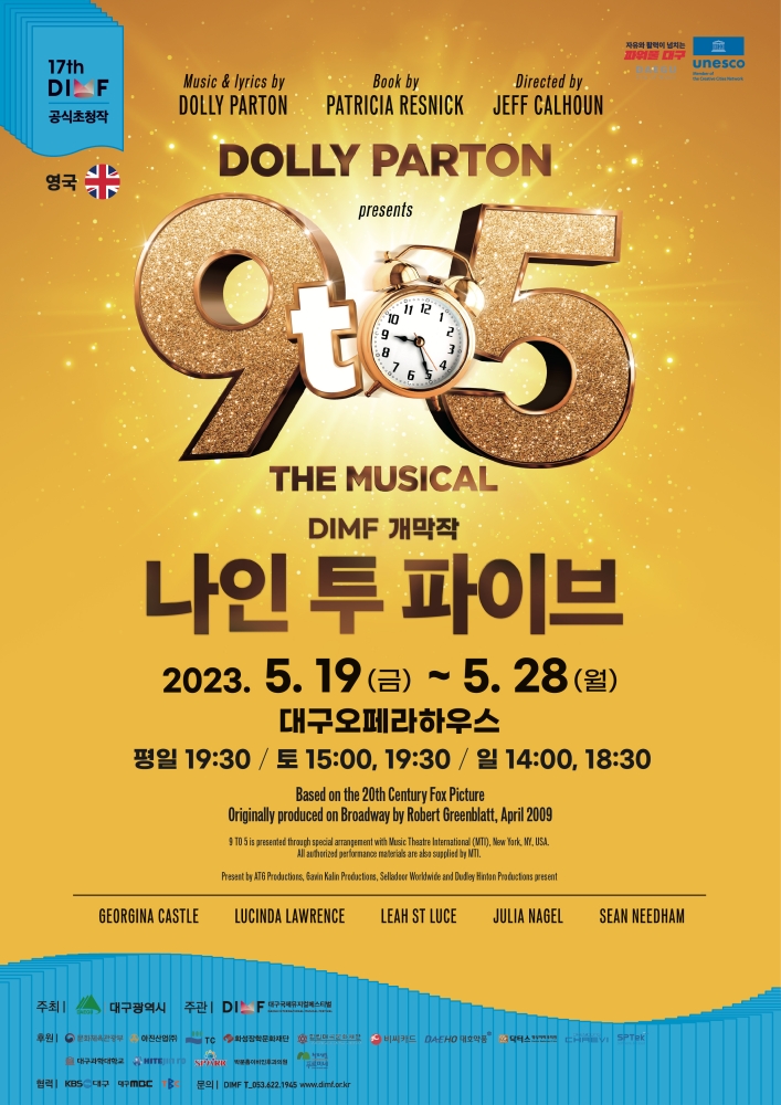 제17회 대구국제뮤지컬페스티벌(이하 DIMF)이 축제의 라인업 가운데 역대 가장 화려한 개막작이 될 뮤지컬 <9 to 5(나인 투 파이브)>(영국)를 선공개하고 본격적인 축제 시즌의 돌입을 알렸다.