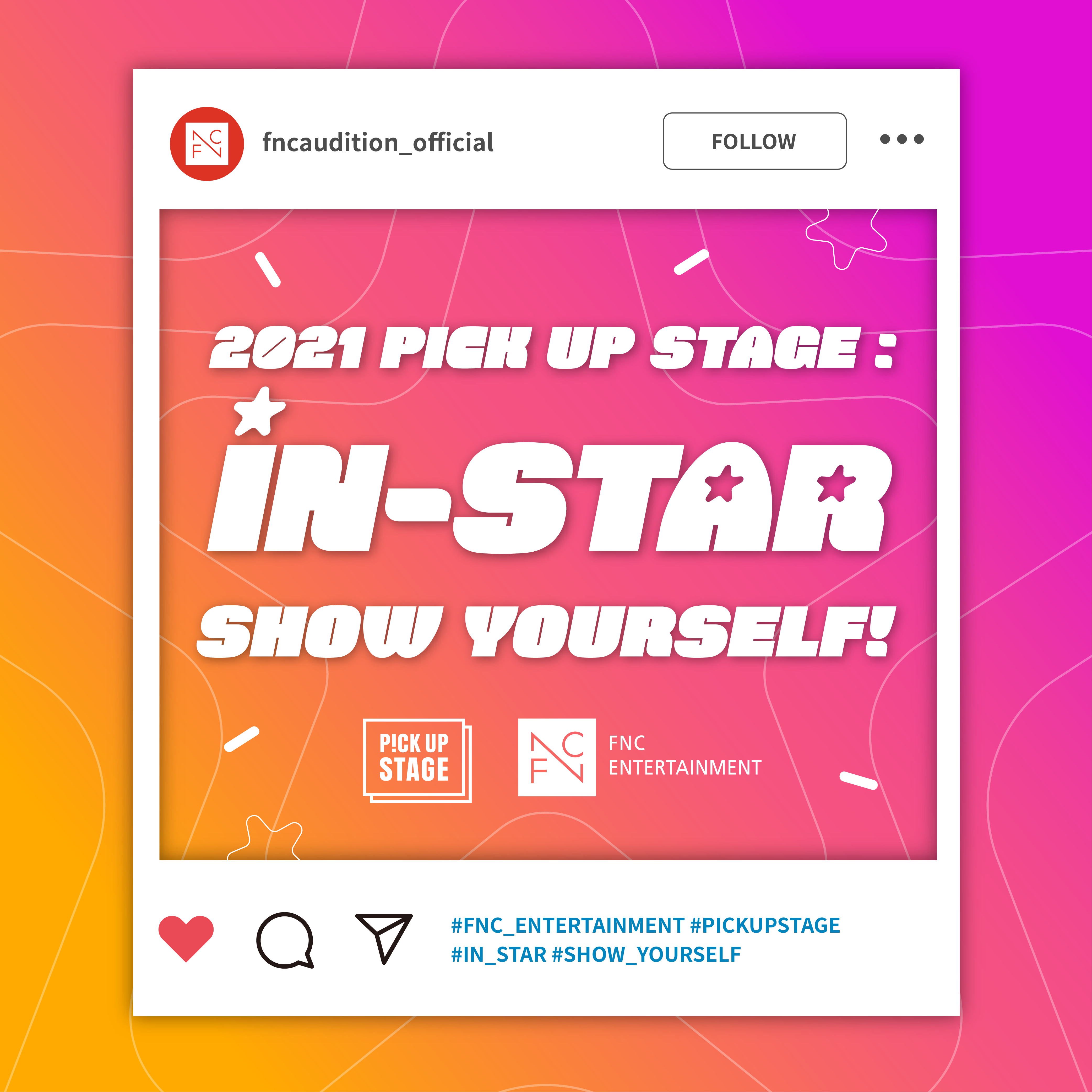 FNC엔터테인먼트는 '2021 FNC PICK UP STAGE : IN STAR(이하 '2021 FNC 픽업 스테이지 : 인 스타')'를 오늘(11월 22일)부터 12월 22일까지 한 달간 진행하며 또 한 번의 글로벌 인재를 찾는다. 'FNC 픽업 스테이지'는 차세대 인재 발굴 오디션 프로젝트로 국내 및 해외를 기반으로 하여 인재 발굴을 진행하는 신인 엔터테이너 육성 프로그램이다.