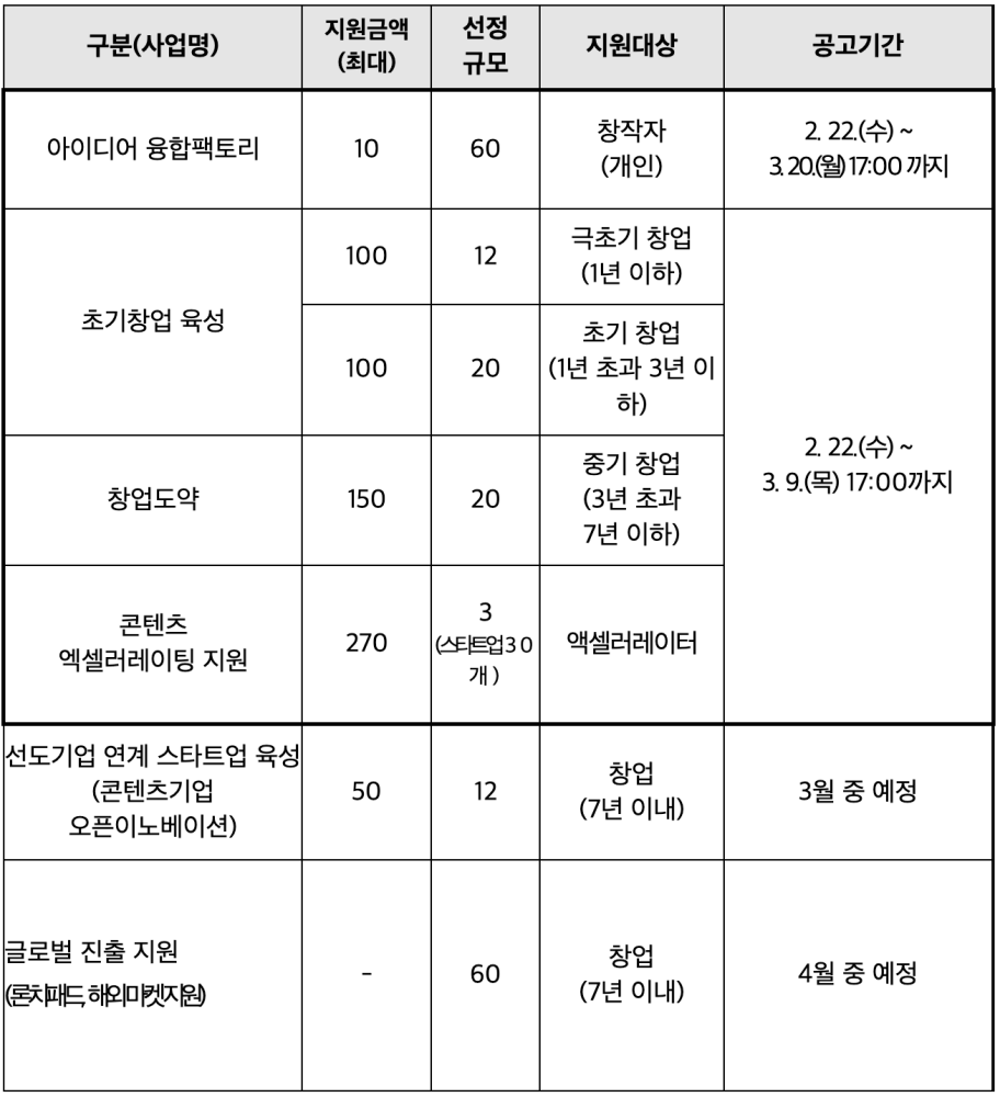 ▲ ‘아이디어 융합팩토리’에 참가할 예비창업자를 2월 22일(수)부터 3월 20일(월)까지, ▲ 초기 스타트업(창업 3년 이하), 창업 도약 프로그램(창업 3년 초과 7년 이하)에 참가할 기업을 2월 22일(수)부터 3월 9일(목)까지 모집한다.